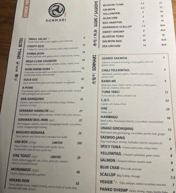 캐비아를 곁들인 바삭한 감자전과 깊은 풍미의 함바고 핸드롤. 한국적 식재료와 일식 테크닉이 만난 손말이만의 독창적인 메뉴들.[사진 스시뉴스LA]감자전은 옆에 크림소스를 캐비아와 같이 먹을 수 있는 퓨전 요리로 인기를 끌고 있고, 노리 비빔 소바와 미소 클램 차우더 등 한국 음식과 서양 음식의 장점을 합친 각종 퓨전 메뉴들이 갖춰져 있다. 특히 미소 국물로 만든 클램 차우더는 뉴잉글랜드 클램 차우더 맛을 미소 국물을 통해 신기하게 요리해 냈다. 노리 비빔 소바는 오이, 무, 에다마메 등 익숙한 재료들과 비벼서 만든 소바 국수로 전혀 양이 적지 않아서 3명이 2개를 시켜서 충분히 먹을 수 있었다.