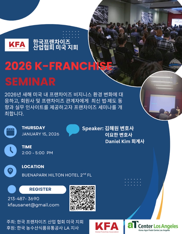 한국프랜차이즈 산업협회 미국지회(KFA USA)는 회원사와 프랜차이즈 관계자들을 대상으로 최신 법·제도와 실무 인사이트를 공유하기 위해 이번 연례 세미나를 무료로 개최한다고 밝혔다.