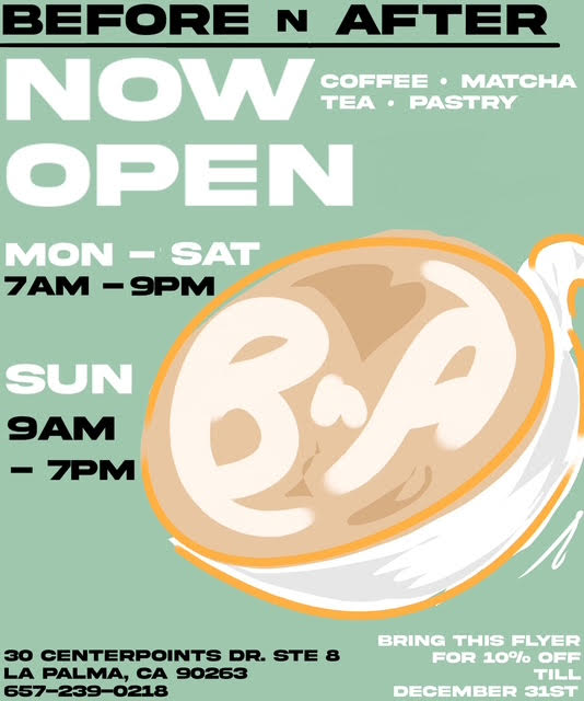 연말연시를 맞아 ‘비포 앤 애프터’ 카페는 이 기사에 첨부된 비포 앤 애프터 오프닝 플라이어를 12/31/25까지 가져오는 손님들에게는 10% 할인 혜택이 제공된다.