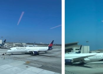 SNS에 게시된 사진에는 랜딩기어 타이어 파손 직후 활주로에서 정차 중인 에어프레미아 YP102편 항공기가 보인다. (출처: Threads 사용자 lucy.hwang) LAX 발...
