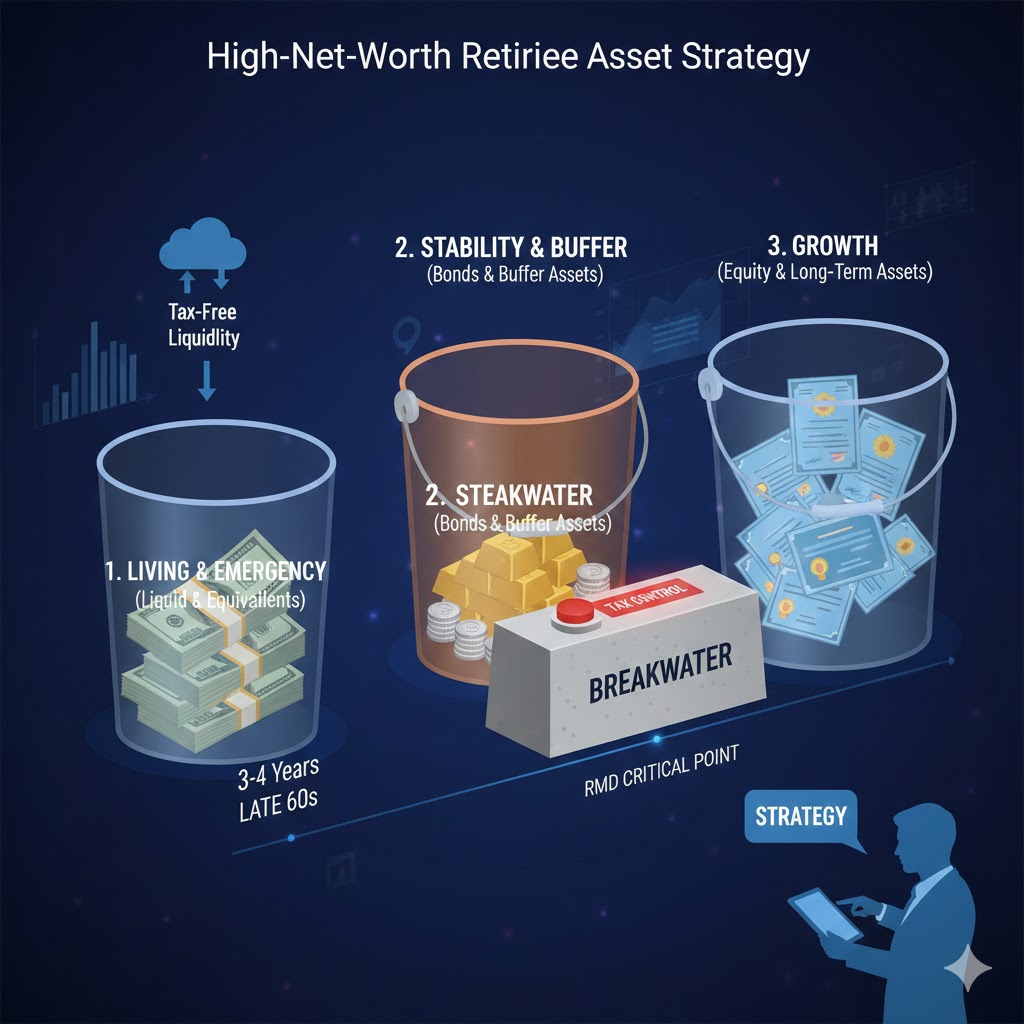 고소득 은퇴자에게 자산 버킷 전략은 더 많은 수익을 추구하기 위한 수단이 아닙니다. 세금을 통제하고, 인출 순서를 관리하며, 시장 충격에도 은퇴 계획이 흔들리지 않도록 만드는 방어적 설계입니다.