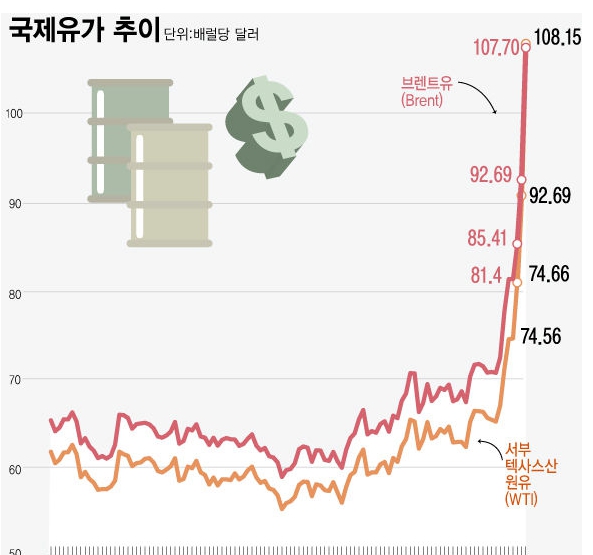 8일 인베스팅닷컴에 따르면 이날 미 동부시간 기준 오후 8시 45분 현재 뉴욕상품거래소 4월 인도분 미국 서부텍사스원유(WTI) 선물 가격은 전 거래일보다 20.22% 폭등한 배럴당 109.29달러에 거래되고 있다. 글로벌 기준유인 브렌트유 5월물 역시 18% 이상 오르며 배럴당 109.42달러를 기록 중이다.