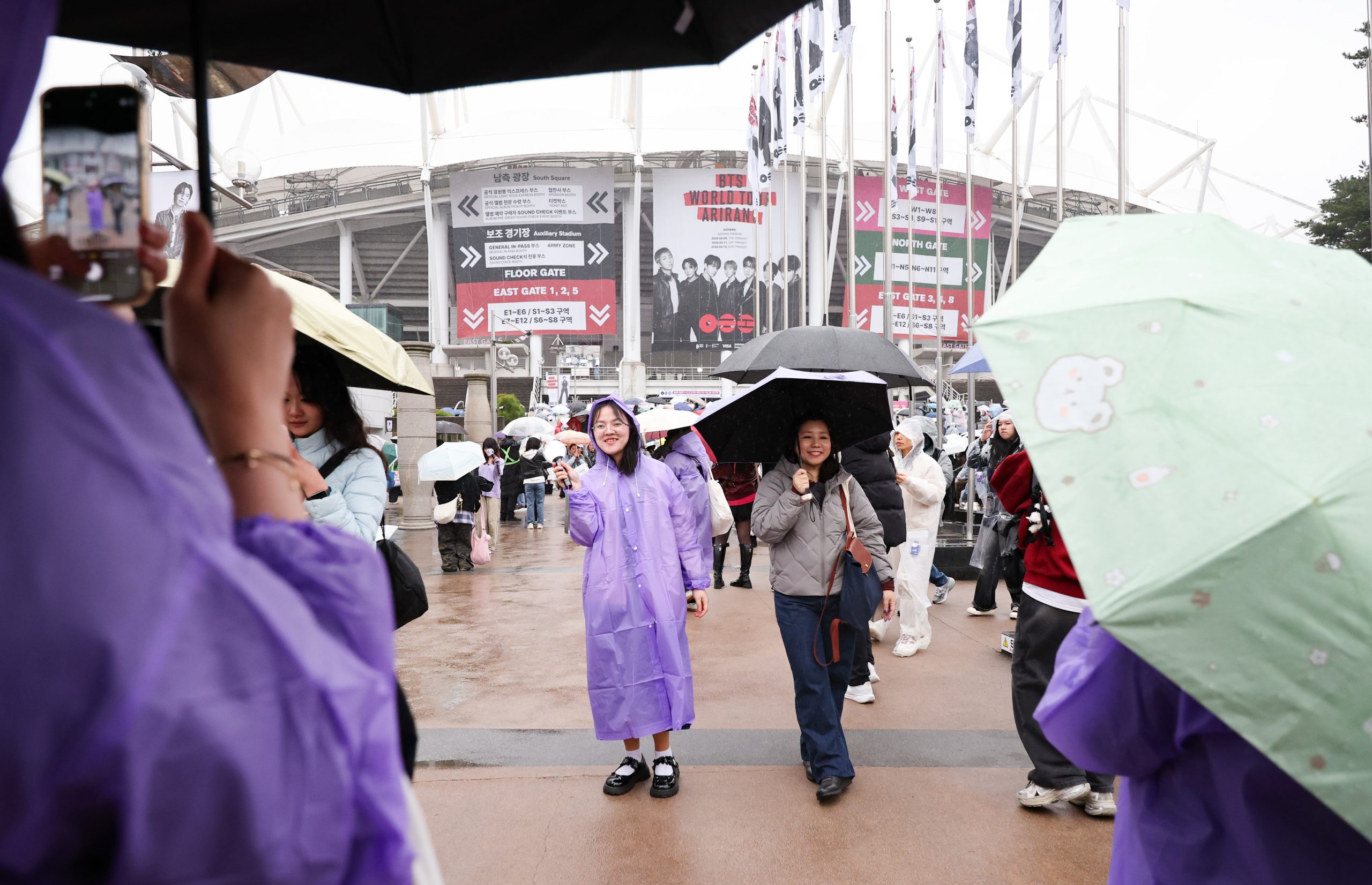 이날 오후 7시 새 월드투어 ‘아리랑’의 첫 공연을 본다는 기대감 덕분이었다. 아미들이 입은 우비에서 가장 많이 눈에 띄는 건, 방탄소년단 상징색인 보라색이었다.