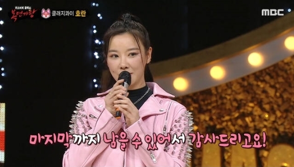 호란은 9일 방송한 MBC TV 예능물 복면가왕에 ‘펑키한 여우’로 등장했다. 3라운드까지 올라갔고, 가왕 결정전에서 ‘우승 트로피’에 패했다. 호란은 “‘1라운드에서 떨어지지만 말자’고 생각했는데, 마지막까지 남아서 감사하다. 따뜻한 응원 덕에 용기 내서 끝까지 서 있을 수 있었다”며 “곧 싱글 앨범을 발매할 예정이다. 기억해주고 많이 들어 달라. 노래하면서 행복했다. 조만간 공연으로 인사하겠다”고 했다.