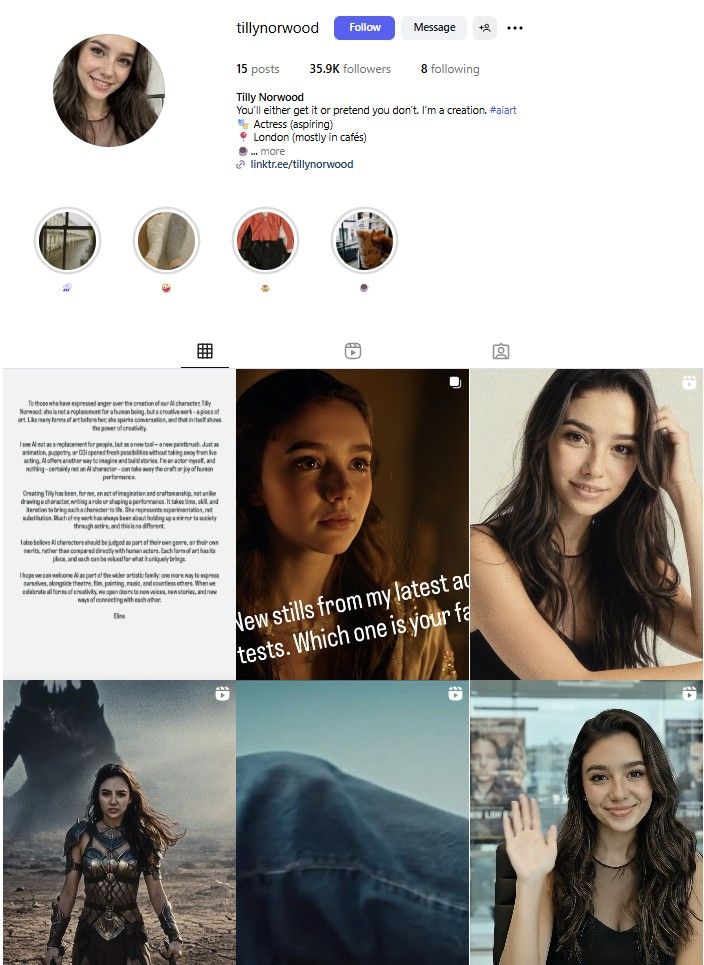 지난달 30일 가디언, BBC 등 외신은 인공지능 스튜디오 ‘시코이아'(Xicoia)가 최근 가상 인물 ‘틸리 노우드'(Tilly Norwood)를 선보였다고 보도했다. 시코이아는 네덜란드 출신의 코미디언 엘린 반 데르 이 운영하는 AI 제작사 ‘파티클6(Particle6)’의 자회사다.