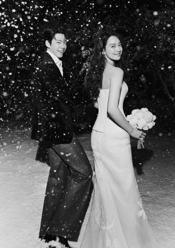 사진에는 턱시도를 입은 김우빈과 웨딩드레스를 입은 신민아가 눈 속에서 환하게 웃고 있는 모습이 담겼다.