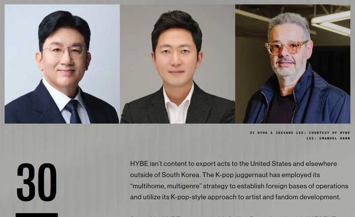 방 의장을 필두로 이 대표이사, 아이작 리 의장 겸 CEO 등 하이브 3인방은 전 세계 음악 산업에서 큰 영향력을 미친 리더 40인을 꼽는 ‘리더보드(Leaderboard)’ 부문 30위에 공동 선정됐다.