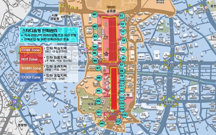 구체적으로 행사 구역을 인파 위험도 및 이동 가능 정도를 고려한 4개 구역(코어·핫·웜·콜드)으로 구분해 단계별로 대응할 방침이다. 직시 관람이 가능한 구역 외곽에 인파 관리선을 설정하고 지정된 통로 29개소를 통해 관람객이 유입되도록 해 공연장 내 인파 밀집도를 안정적으로 관리하는 ‘스타디움형’ 인파 관리 방식을 적용할 계획이다.