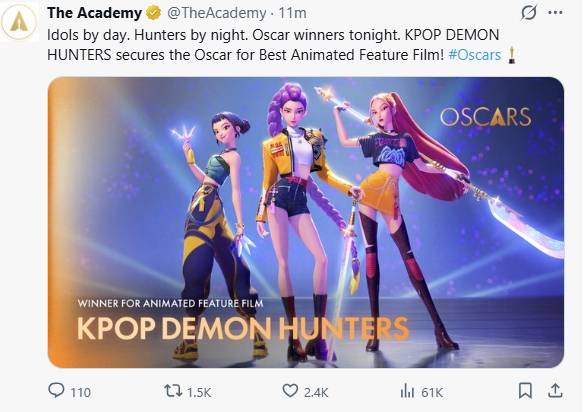 영화 ‘케이팝 데몬 헌터스’가 오스카를 품에 안았다.