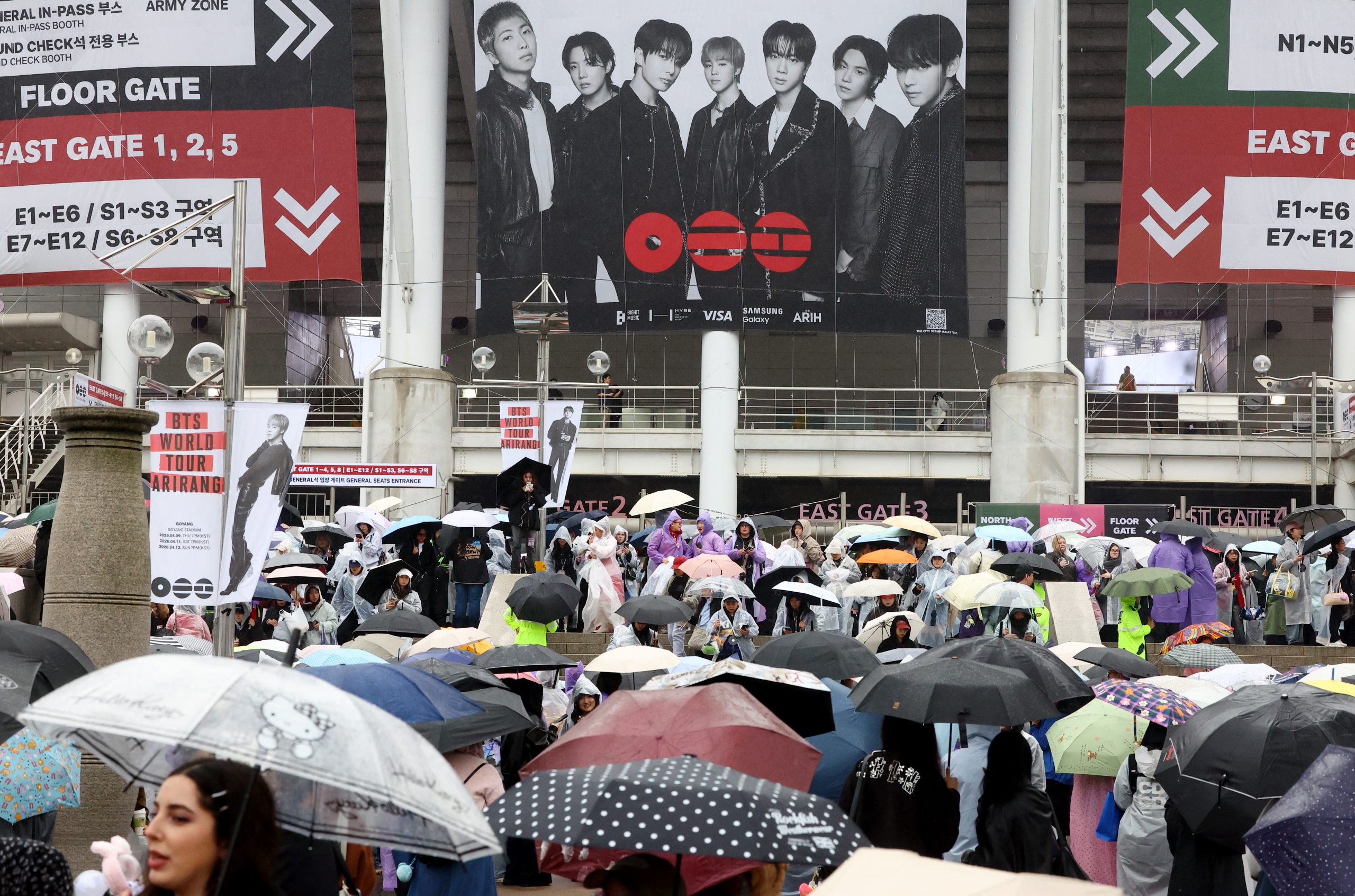 눈꽃 대신 강한 봄비가 내리는 9일 오후 경기 고양 고양종합운동장 주경기장 앞. 형형색색 우산을 든 글로벌 슈퍼 그룹 ‘방탄소년단'(BTS) 팬덤 ‘아미’들은 궂은 날씨에도 설렘이 가득했다.