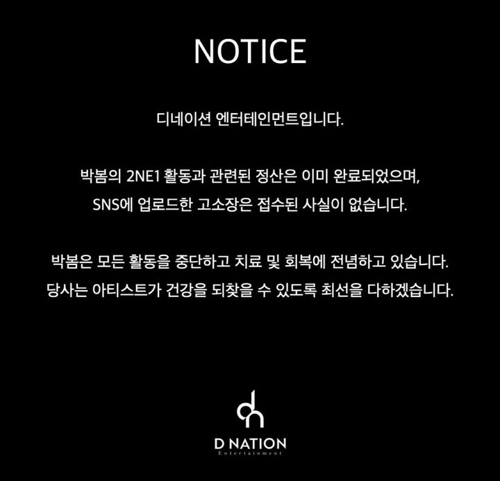 디네이션은 “박봄은 모든 활동을 중단하고 치료 및 회복에 전념하고 있다. 당사는 아티스트가 건강을 되찾을 수 있도록 최선을 다하겠다”고 덧붙였다.