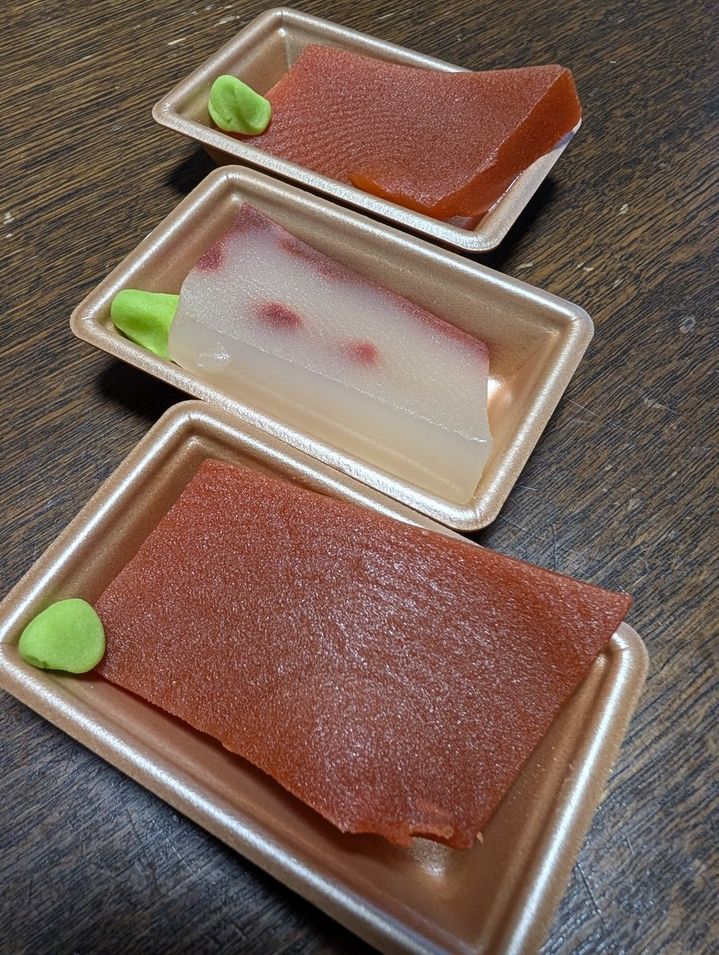 12일 일본 매체 ‘오타쿠마경제신문’에 따르면 최근 일본 후쿠시마현 아이즈와카마쓰시에 위치한 전통 과자점 ‘오카시노쿠라 타로안’이 최근 소셜미디어(SNS)를 통해 공개한 ‘사시미 양갱’ 사진이 화제를 모으고 있다.