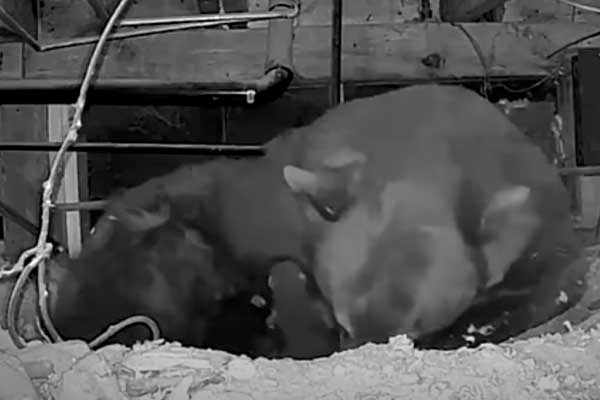 오두막 밑에서 한 곰이 새끼를 낳고 젖을 주고 있다. 베어리그