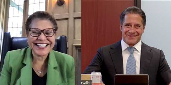LA 통합교육구 안전문제와 관련해 줌미팅을 하고 있는 캐런 배스 LA시장(왼쪽)과 LA통합교육구의 알베르토 카르발효 교육감. 알베르토 카르발효 트위터