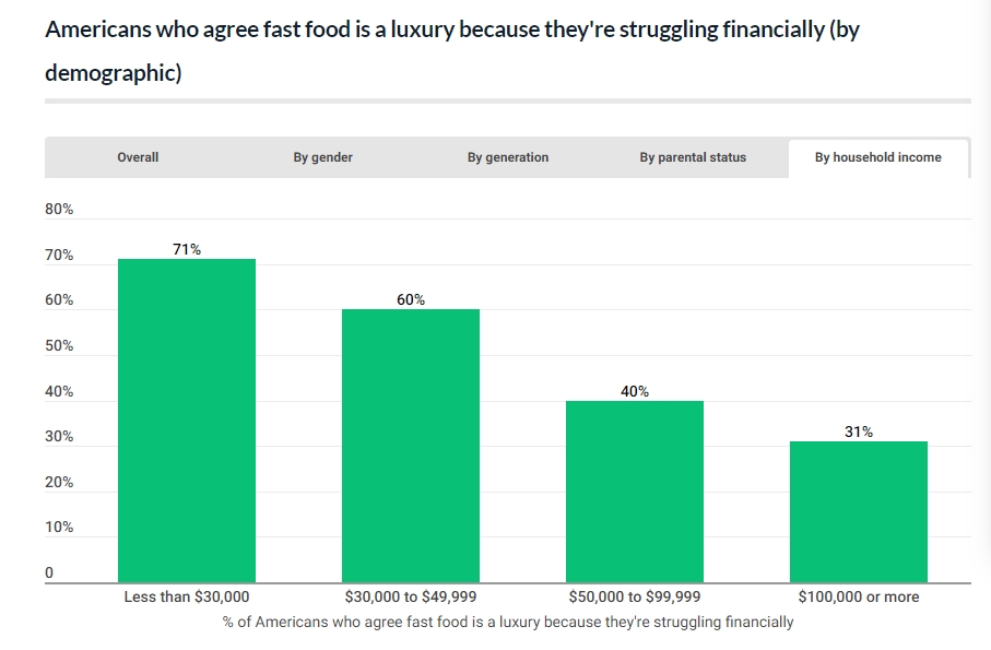 특히 연소득 3만달러 이하의 저소득층(71%), 어린 자녀를 둔 부모(58%) 등은 패스트푸드를 더 이상 쉽게 사 먹기 어려운 사치품으로 생각하는 것으로 나타나 저소득 계층은 패스트푸드는 더 이상 저렴한 음식으로 여기지 않고 있는 것으로 나타났다. 연소득 3만달러-5만달러 계층에서도 패스트푸드가 사치품이라고 응답한 비율이 60%나 되는 것으로 나타났다.