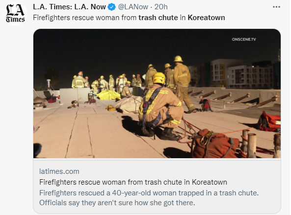 30일 LA 타임스에 따르면, 29일 밤 8시 30분경 한인타운 8가와 호바트 스트릿(817 S. Hobart)에 있는 한 4층 아파트 건물에서 쓰레기 투입구에 빠져 옴짝달싹 못하고 갇혀있던 여성 주민이 소방대에 구조됐다.