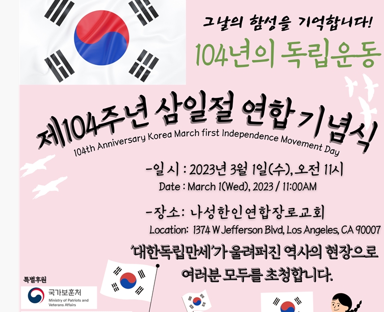 104주년 삼일절 기념 행사가 1일 나성한인 연합 장로교회에서 범 커뮤니티 차원의 연합 기념행사로 개최된다.