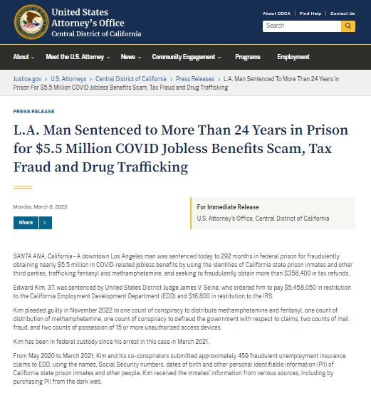 연방 검찰에 따르면, 김씨는 2020년 5월부터 2021년 3월까지 공모자들과 함께 주 교도소 수감자들의 이름과 사회 보장 번호, 생년월일 및 기타 개인 식별 정보(PII)를 사용하여 EDD에 459건의 실업수당을 사기 청구한 것으로 드러났으며 이를 위해 다크 웹에서 PII를 구매하기도 한 것으로 나타났다.