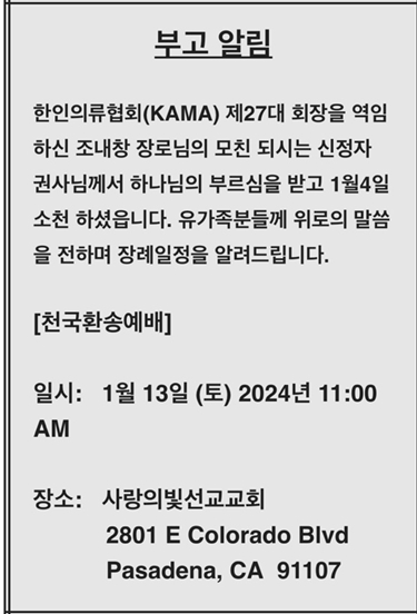 오는 13일 오전 11시 패사디나 사랑의 빛 선교 교회에서 천국환송예배가 열린다.