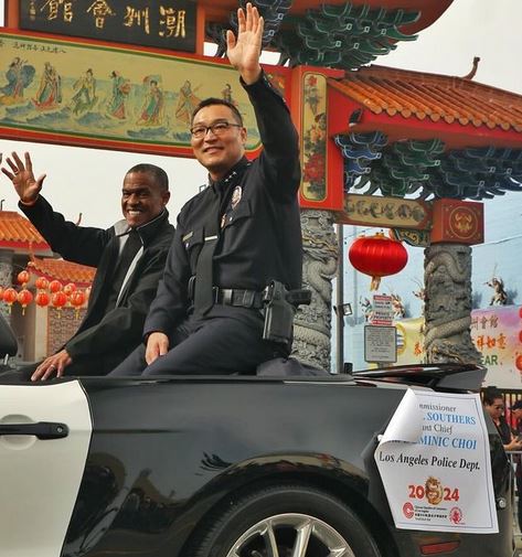 17일 차이나타운 골든 드래곤 퍼레이드에 참석한 도미닉 최 LAPD 임시국장이 고관중들에게 손을 흔들고 있다[LAPD]
