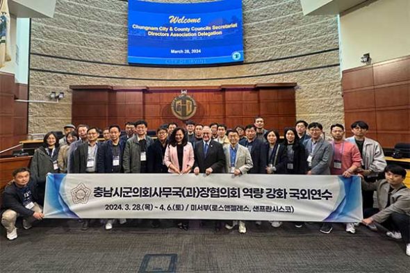 어바인 시, 태미 김 시의원이 지난 28일 국외연수로 미국을 방문한 충남시군의회사무국장협의회 (이하 ‘협의회’) 소속의 30명을 초대하여 어바인 시청에서 질의응답 시간을 갖고 어바인 시의 운영, 시의회의 역할, 조직 구조에 대한 대화를 나눴다.