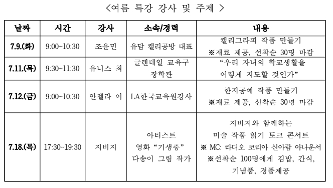 LA한국교육원(원장 강전훈)은 7월 9일부터 7월 18일까지 “여름의 성장과 배움 – 성인과 학생을 위한 여름 특강”을 LA한국교육원에서 개최한다.