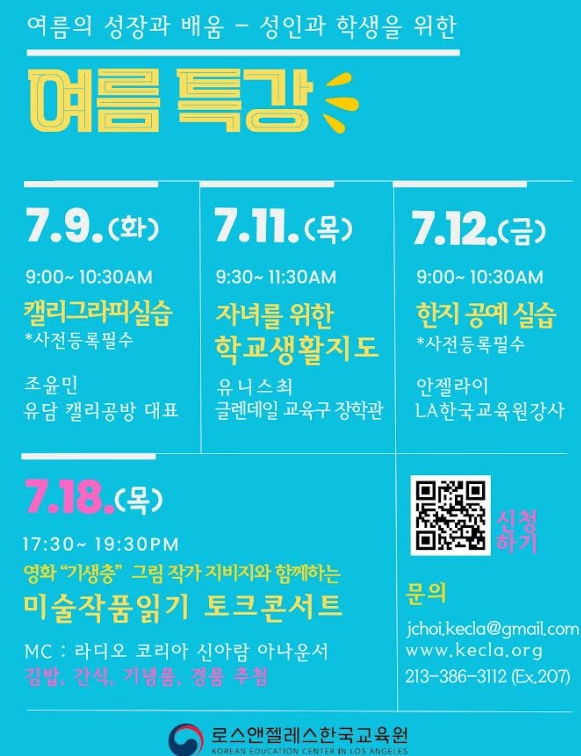 여름 특강은 무료로 진행되며, 담당자 이메일(jchoi.kecla@gmail.com) 또는 전화(213-386-3112 내선 207) 및 방문하여 신청할 수 있고, 자세한 정보는 LA한국교육원 홈페이지(https://kecla.org)를 통해 확인할 수 있다.