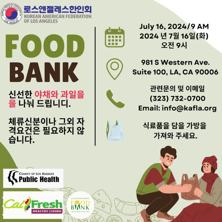 LA 리저널 푸드뱅크는 한인타운에 여는 첫 푸드뱅크 행사를 오는 7월 16일 LA 한인회에서 개최한다.