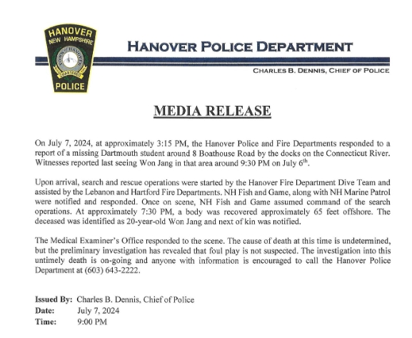 뉴햄프셔 하노버 경찰는 7일 보도자료를 통해 20살 장원씨의 시신이 이날 오후 7시 30분경 커네티컷 강에서 65피트 떨어진 강변에서 발견됐다고 밝혔다.