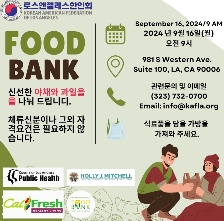 이번 푸드뱅크에는 딸기, 배 등 계절과일과 야채를 배부하며 추석을 맞아 LA카운티 2지구 Holly Mitchell 수퍼바이저의 후원으로 쌀과 라면 등의 추가 식료품도 증정한다.