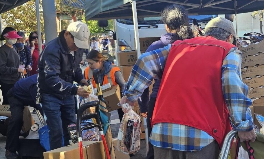LA시 농무국과 시니어센터가 손잡고 매달 진행하고 있는 푸드뱅크 행사는 이날 오전 9시부터 2 시간 동안 시니어센터 정문 앞에서 진행돼 104명이 다양한 음식이 든 박스와 통조림, 시리얼, 식빵, 신선한포도, 사과주스, 우유, 치즈 등을 받았다.