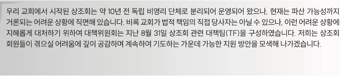 교회는 이날 주보에서 “우리 교회에서 시작된 상조회는 약 10년 전 독립 비영리 단체로 분리되어 운영돼 왔으나, 현재는 파산 가능성까지 거론되는 어려운 상황에 직면해 있다”며 “비록 교회가 법적 책임의 직접 당사자는 아닐 수 있으나, 대책위원회를 구성해 지혜롭게 대응하겠다”고 밝혔다. 이어 “회원들이 겪고 있는 어려움에 깊이 공감하며, 기도와 함께 가능한 지원 방안을 모색하겠다”고 덧붙였다.