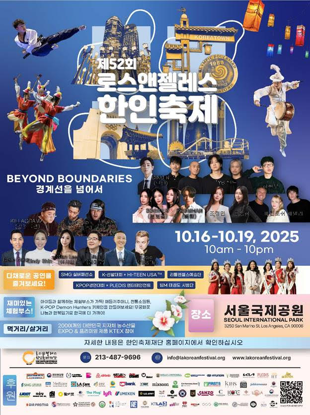 올해 한인축제는 ‘Beyond Boundaries–경계선을 넘어서’를 주제로 10월 16일(목)부터 19일(일)까지 나흘간 서울국제공원에서 열린다. 매년 35만 명 이상이 찾는 남가주 대표 문화축제로, 한인사회는 물론 다양한 인종과 문화가 함께 어우러지는 행사로 자리 잡았다.