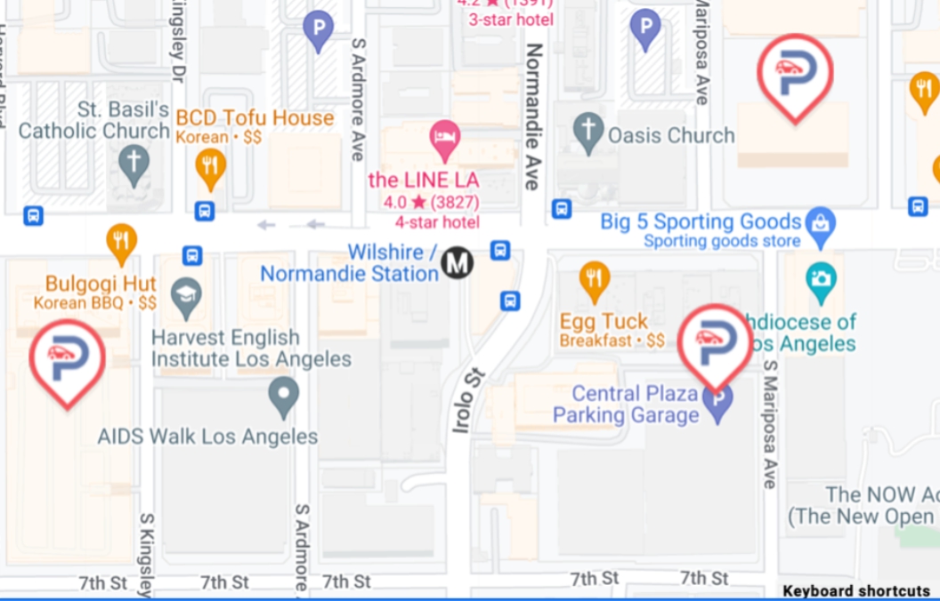 유료 주차장은 ▲ACH(3335 Wilshire Blvd.) ▲에퀴터블 플라자(3435 Wilshire Blvd.) ▲센트럴 플라자(3450 Wilshire Blvd.) ▲SP+(3600 Wilshire Blvd.)에서 이용 가능하며, Parking.com 전용 페이지를 통해 사전 결제할 수 있다.