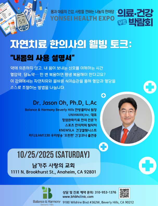 오는 25일 토요일, 애너하임에 위치한 남가주 사랑의 교회(1111 N. Brookhurst St., Anaheim, CA 92801)에서 열리는 연세헬스엑스포(Yonsei Health Expo)에서는 ‘자연치료 한의사의 웰빙 토크: 내 몸의 사용 설명서’를 주제로 제이슨 오 박사(Dr. Jason Oh, Ph.D., L.Ac)의 강연이 진행된다.