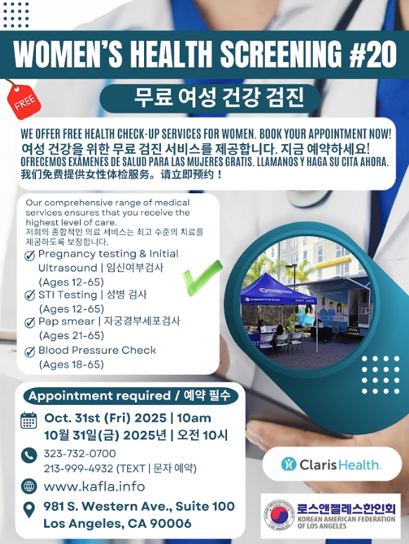 이번 검진은 사전 예약이 필수이며, 예약은 한인회 사무국(323-732-0700) 또는 문자(213-999-4932)를 통해 가능하다.
