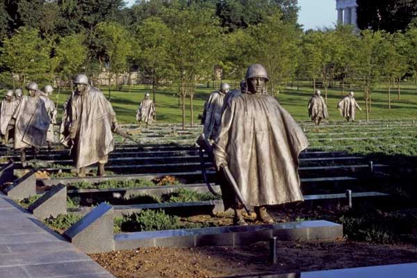 워싱턴 DC 한국전 참전용사 기념공원 내에 있는 참전용사 동상. 19개의 조각상은 한국전 당시 38선을 따라 순찰하는 병사들의 모습을 형상화한 것으로 360도를 모두 경계하는 군인들이라는 설명이다. 국립공원국
