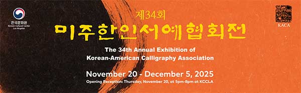 「제34회 미주한인서예협회 정기전」은 11월 20일(목) 개막식을 시작으로, 12월 5일(금)까지 LA한국문화원 2층 아트갤러리에서 진행된다. 자세한 문의는 LA한국문화원 전시 담당 태미 조(323-936-3014)에게 하면 된다.