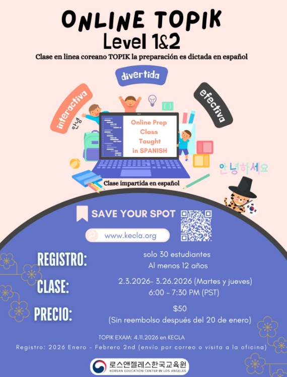 LA한국교육원(원장 강전훈)은 2026년 TOPIK I(1·2급) 응시를 목표로 하는 스페인어 강의 준비반을 새로 운영한다고 밝혔다.