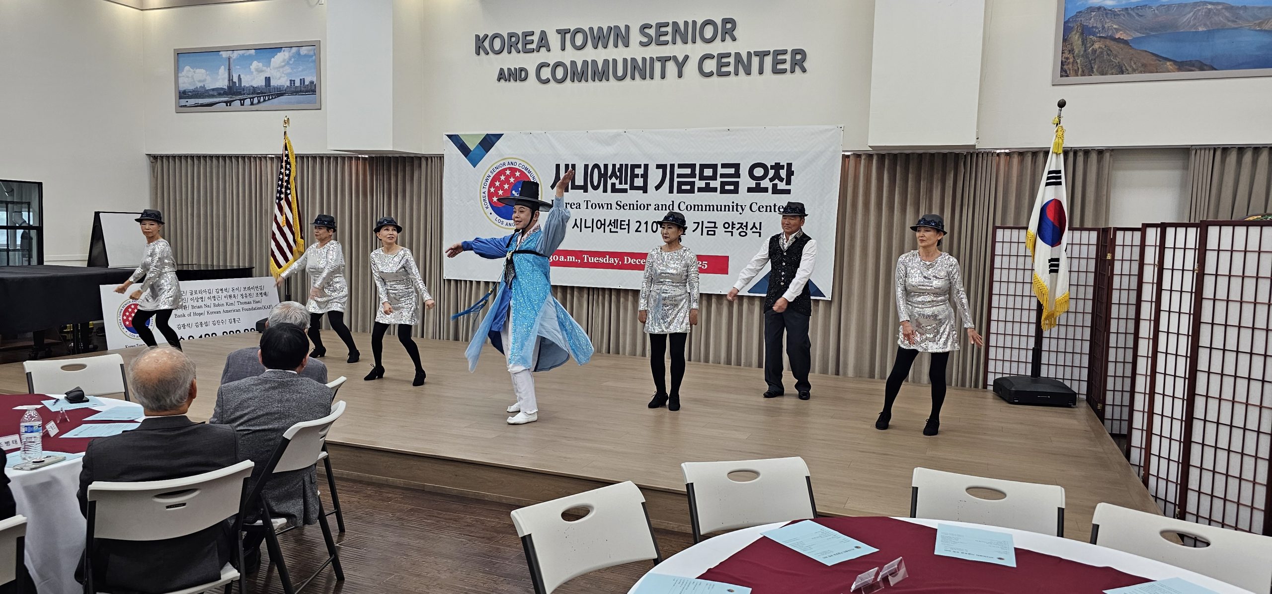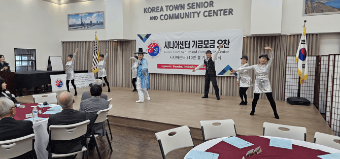 시니어센터 210만 달러 기부 약정식에서 시니어 공연단이 ‘K-팝 데몬 헌터스’ 댄스 무대를 선보이며 참석자들의 큰 박수와 환호를 받았다. 사진=Korea Town Senior & Community Center