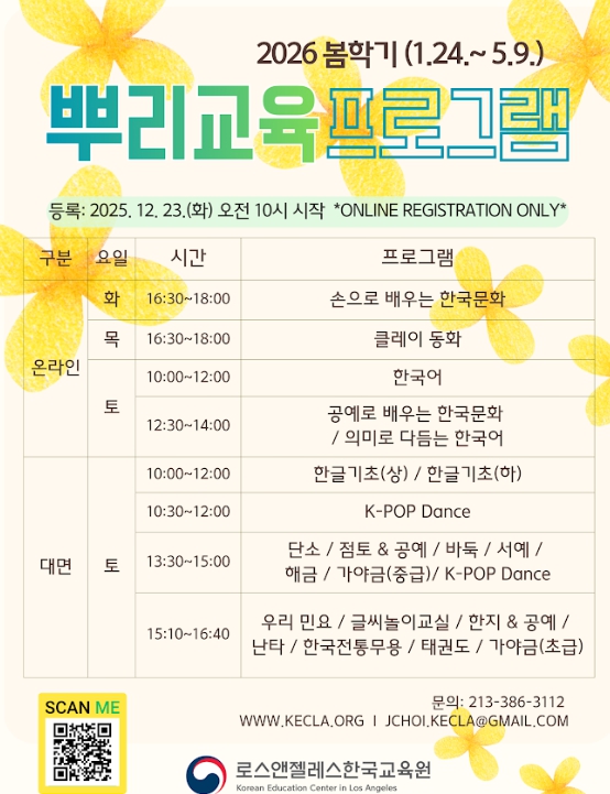 LA한국교육원이 2026 봄학기 뿌리교육 프로그램 수강생을 모집한다.