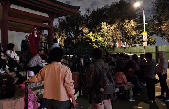 한인 시니어들이 시니어센터 앞에서 밤샘 줄서기를 하고 있는 모습