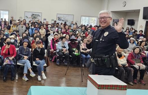 한인타운 시니어&커뮤니티 센터 2026년 1학기 프로그램 접수를 위한 추첨이 진행된 가운데, LAPD 경관이 현장을 찾아 어르신들에게 인사를 건네며 안전하고 공정한 절차 진행을 돕고 있다.
