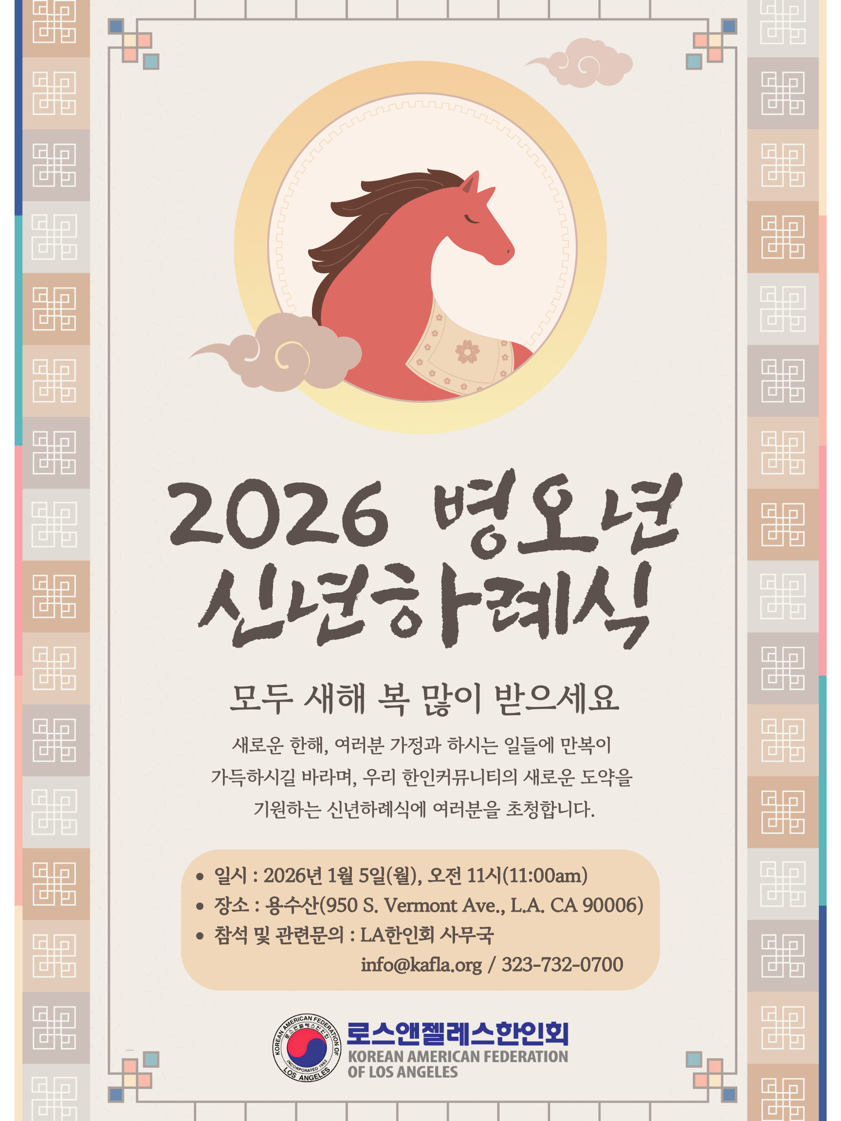 로스앤젤레스 한인회가 2026년 병오년 새해를 맞아 한인사회 결속과 도약을 다짐했다. 로스앤젤레스 한인회는 1월 1일 로버트 안 회장 명의의 신년사를 발표하고, 이어 1월 5일 신년 하례식을 개최하며 새해 공식 행보에 들어갔다.