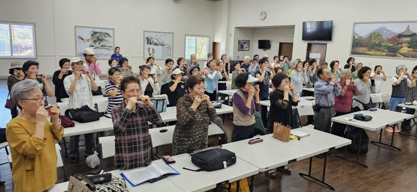 시니어센터 하모니카 앙상블은 지역 커뮤니티 시니어들이 주축이 된 팀으로, 대형 스포츠 이벤트에서 국가 연주 무대에 오르며 한인 사회의 문화적 존재감을 넓혀가고 있다.
