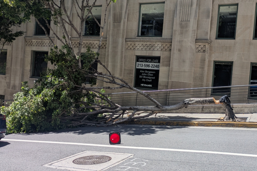 LA 다운타운 그랜드 애비뉴 인근에서 잘려 쓰러진 가로수가 도로 위를 가로막고 있다. 최근 다운타운 일대에서 여러 그루의 나무가 훼손·제거된 정황이 잇따라 목격되면서 가로수 관리와 보호 필요성이 다시 제기되고 있다.사진 출처: X @PanchoPepeKage