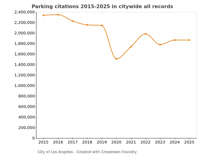 크로스타운 분석에 따르면 LA시는 2015년 238만 건의 주차 티켓을 발부했다. 지난해는 189만 건으로 약 20.2% 줄었다. 재정 적자와 단속 요원 감소, 코로나19 기간 벌금 유예 등이 영향을 미쳤다.
