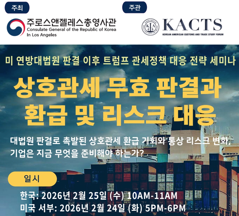 LA총영사관은 연방 대법원이 국제비상경제권한법(IEEPA)에 근거해 부과된 트럼프 행정부의 상호관세를 위법하다고 판결한 것과 관련해 긴급 온라인 세미나를 개최한다.