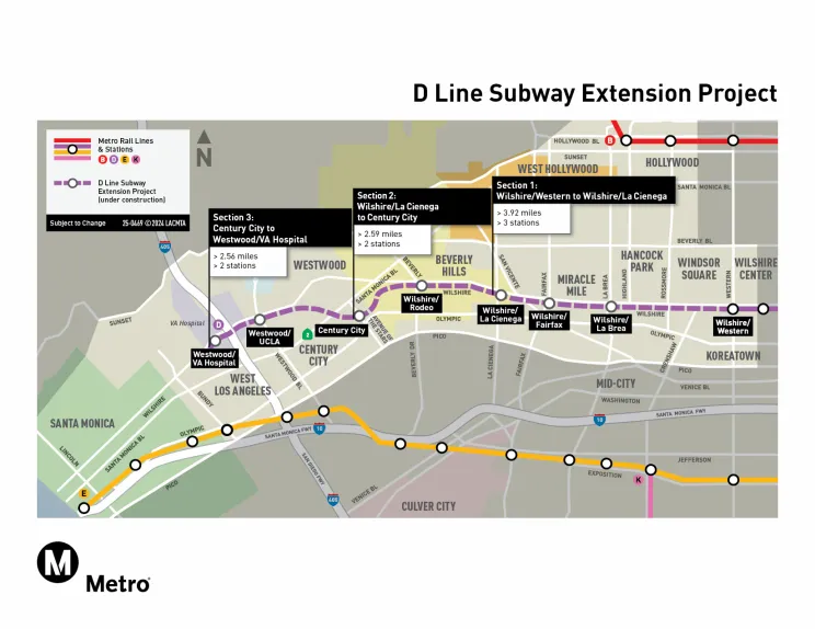이번에 개통되는 1단계는 기존 윌셔/웨스턴 역에서 서쪽으로 약 3.9마일 연장되는 노선으로, 윌셔/라브레아, 윌셔/페어팩스, 윌셔/라시에네가 등 3개 신규 역이 포함된다.