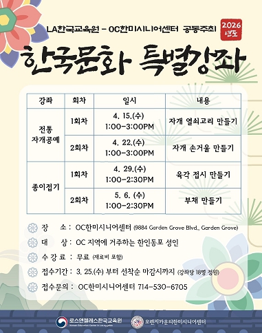 LA한국교육원(원장 이병승)은 OC한미시니어센터(회장 김가등)와 공동으로 오는 4월 15일부터 약 한 달간 오렌지카운티 지역 한인 성인을 대상으로 ‘찾아가는 한국문화 특별강좌’를 실시한다고 밝혔다.